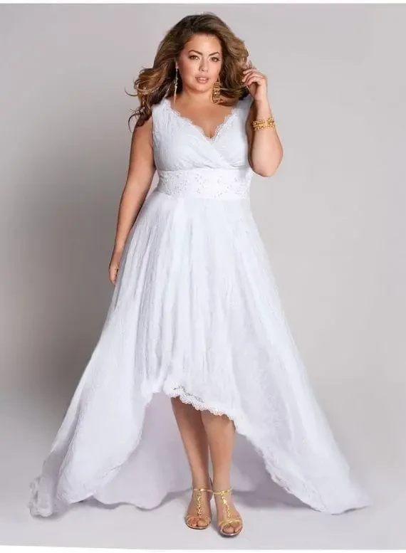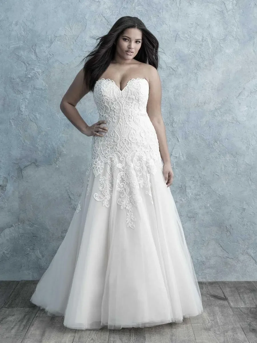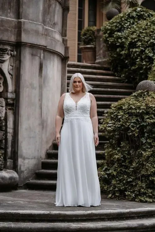 This type of dress is an excellent choice for plus size brides as it visually increases your height and elongates the entire body shape.
