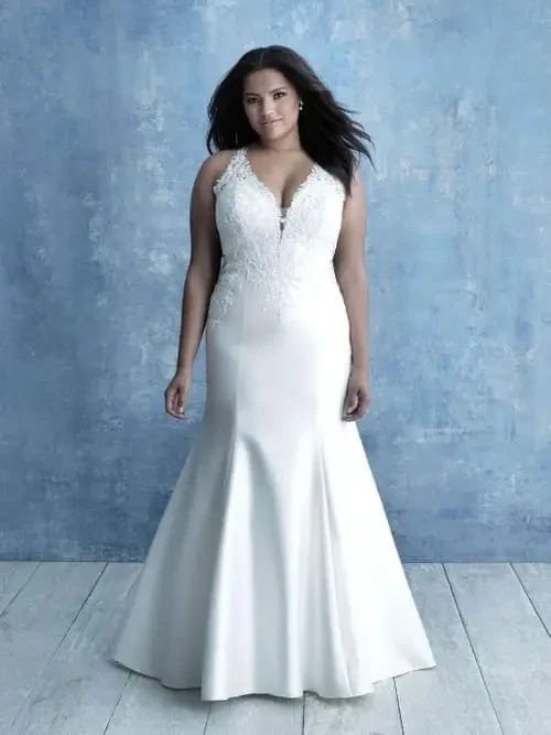 The main advantage of the trumpet dress is that it accentuates the hips and the waist. This creates the optical illusion of a slimmer body and it’s perfect for plus size brides.