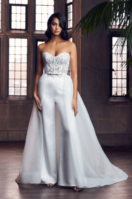A carefully chosen quality wedding jumpsuit brings the attention on the waist and accentuates the legs which also helps you create the effect of a slender shape. It’s the perfect choice for those of you who want a structured and balanced wedding look.