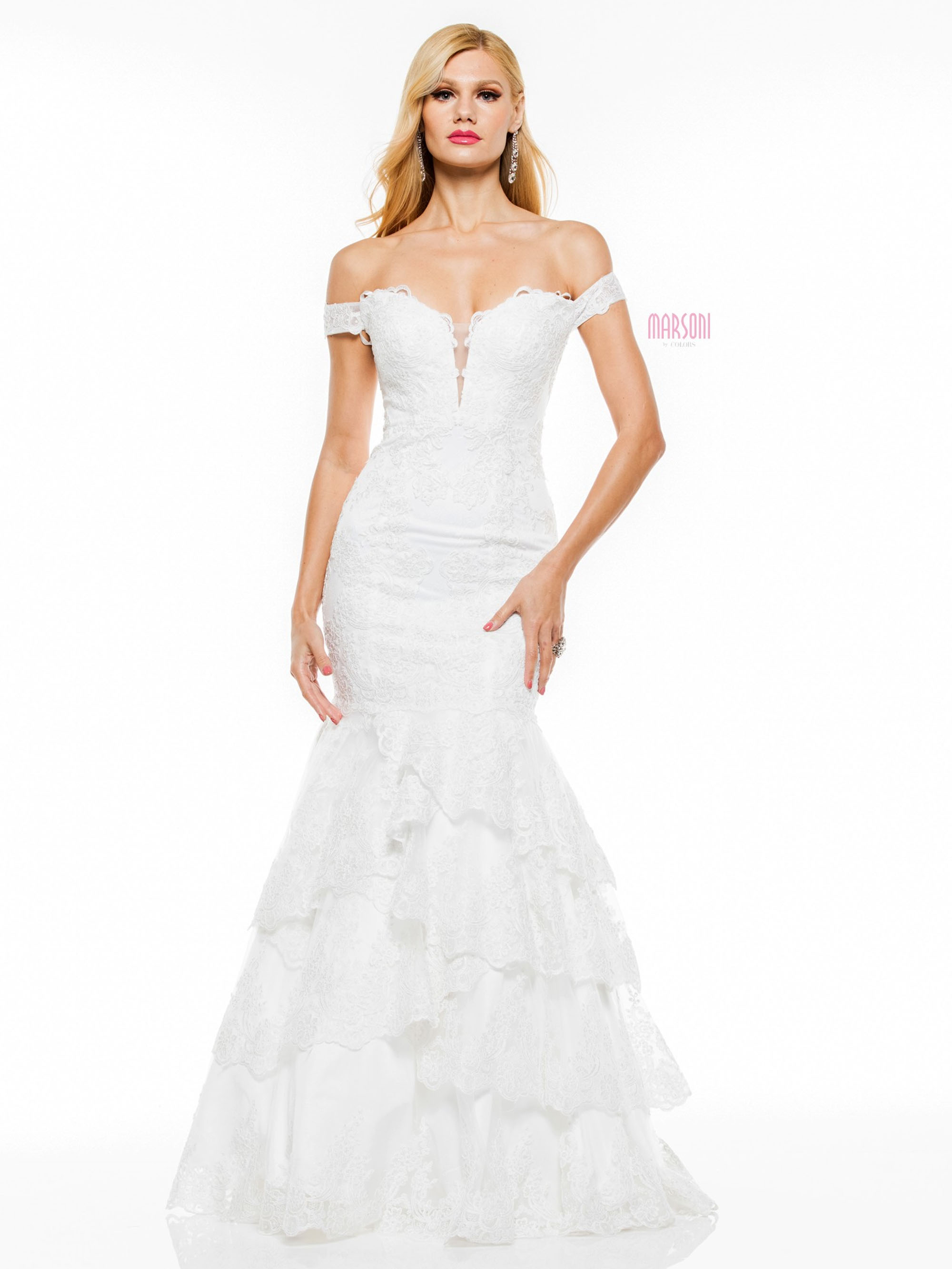 Any mom would look fabulous on the wedding day in this gown. This off-the-shoulder gown has a fit and flare silhouette. It has a deep plunging neckline to add a bit of sexiness. The ruffled skirt brings in a little drama to finish the look.