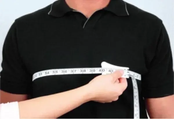 Have the gentleman move his arms outward. Place the tape under his arms and around the broadest part of his chest. Lower the arms to the side and relax
