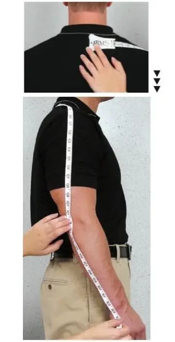 Start the tape at the base of the neck centered with the spine. Make sure the tape measure goes over the top of the gentleman’s shoulder. Take the tape down the arm to the point of their elbow and then measure an inch past the wrist bone. It is always better to measure long versus short because a sleeve that is too short will likely be unacceptable.