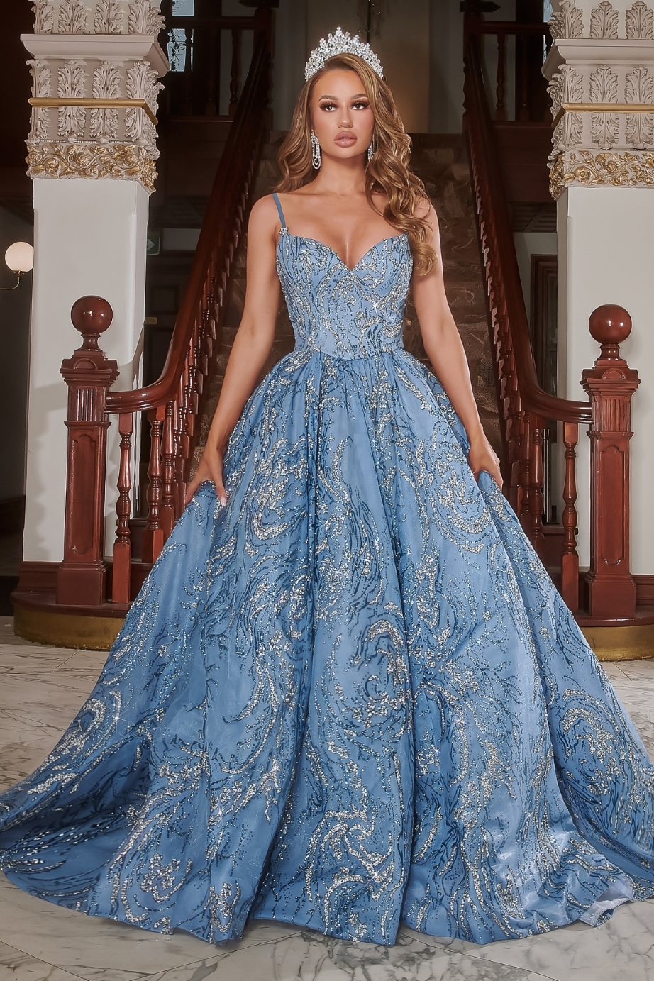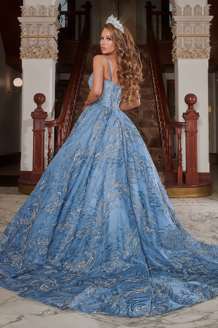 The pageant dress, style PS22050, by Portia & Scarlett, is a breathtaking blend of elegance and enchantment. Cloaked in a captivating shade of powder blue, the gown boasts intricate patterns of shimmering silver sequins and beadwork, creating an effect reminiscent of cascading water or a starry night sky. Its beautifully structured bodice showcases a flattering sweetheart neckline with delicate spaghetti straps, leading the eye to the impeccably defined waist. The voluminous ball gown skirt unfurls with grace, featuring layers of the ornate sequined design, which culminates in a sweeping train. To complete the ethereal aesthetic, the wearer dons a sparkling tiara, making her every step on the stage feel like a fairy tale come to life.