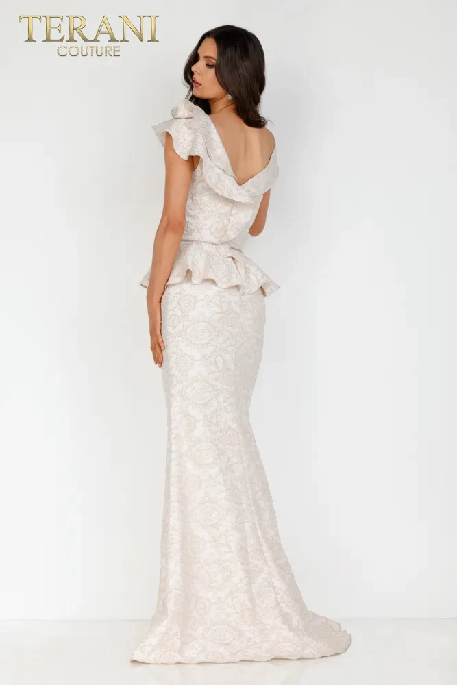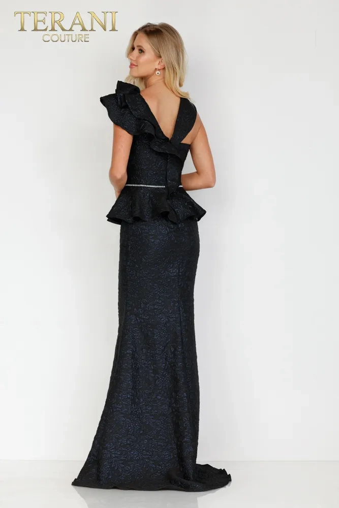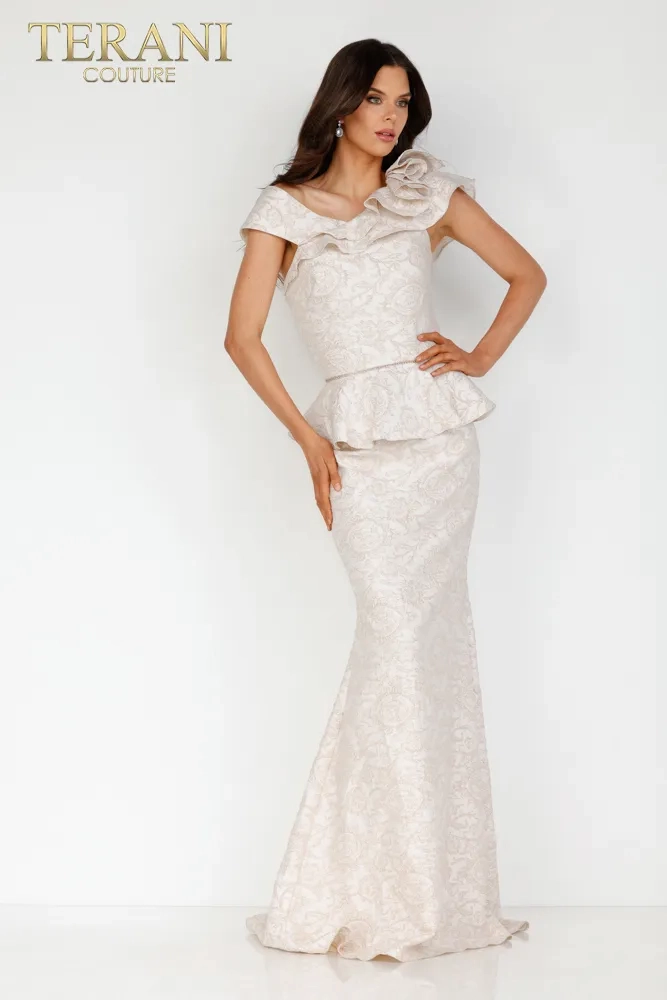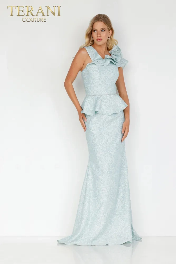 The mother of the bride or groom's dress style 2011M2167 by Terani Couture, is a graceful and elegant full-length gown with sophisticated charm. The dress is designed in a soft powder blue, a color that conveys tranquility and refined taste. This gown features a peplum waist and a contemporary twist to a classic silhouette, creating a flattering shape that accentuates the waistline. The bodice is structured, providing a sleek, form-fitting, modern, and flattering look. One of the striking elements of this dress is the single-shoulder ruffle detail that cascades elegantly, adding a dramatic touch and enhancing the gown's visual interest. This asymmetric feature adds a unique and fashionable flair, making it stand out. The dress's fabric is a luxurious brocade or lace with a subtle pattern, giving it a rich texture and depth. The mermaid silhouette of the gown flows into a gentle sweep train, contributing to the garment's overall elegance. This Terani Couture dress is ideal for a mother who wants to look polished and poised, with a touch of contemporary styling that remains timeless and appropriate for such a significant occasion.